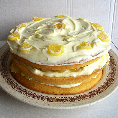 A Lemon and Coconut sponge triple layered and sandwiched together with Lemon Curd and light Lemony Soft Cheese.