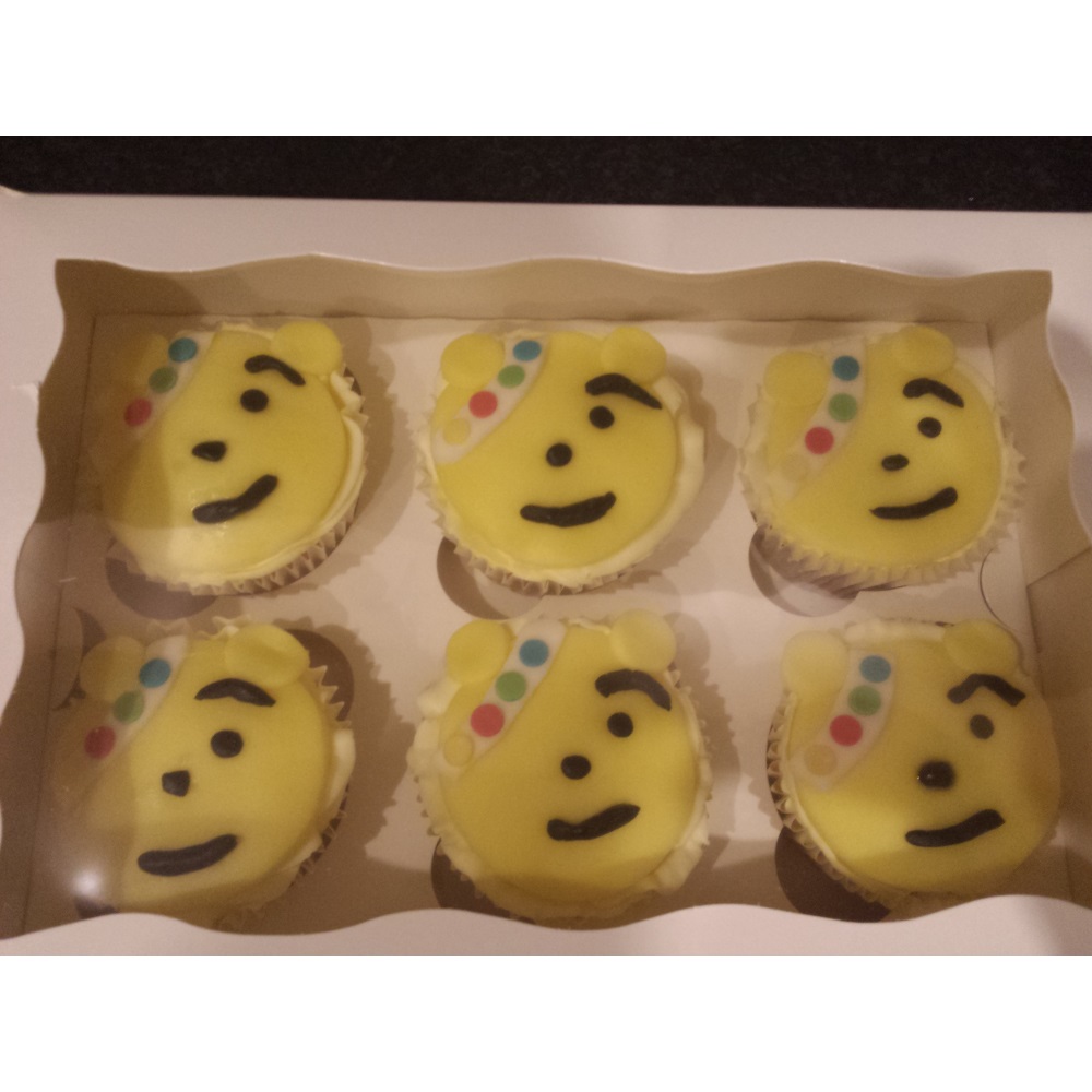 A vanilla sponge with vanilla buttercream. Finished off with fondant Pudsey Bear.